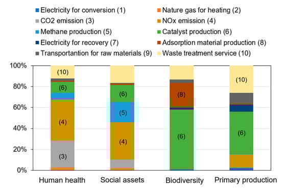 The impact assessment exhibited trade-offs among a dozen environmental burdens. At times it is too complicated to support decision-making in a straightforward manner. To evaluate the consequences of those environmental burdens, the amount of damages for each common endpoint were quantified. Figure 5 presents the results of damages to human health, social assets, biodiversity, and primary production. When the conversion rate was decreased at a lower reaction temperature (S2), human health damage greatly increased. One important reason for this is the deterioration of urban area pollution, which was revealed in the impact assessment. The damage to biodiversity slightly decreased. In the case of changing the feedstock to carbon monoxide and hydrogen (S3), the damages to human health, social assets, biodiversity, and primary production increased, but the increments were minor. When ammonia was released into the environment (S4), damages to social assets and primary production both increased remarkably. The environmental impacts of eutrophication and acidification brought about major damages to social assets and primary production. As for halving the capacity and reuse times of adsorption materials (S5), biodiversity damage evidently increased. If the recovery rate was decreased (S6), damages to biodiversity and primary production increased the most. In the optimized scenario (S7), all damages were decreased. The damage to human health was decreased the most, with a value of 40%. Figure 6 presents the contribution of various processes to the damages of the ReNOx in the optimized scenario. It was seen that NOx emissions contributed 39% to human health damage. As for the damage to social assets, NOx emission, methane production, catalyst production, and waste treatment service contributed 36%, 19%, 16%, and 16%, respectively. Biodiversity damage was mainly derived from catalyst production (57%), followed by adsorption material production (23%), among others. In addition, catalyst production and waste treatment are critical processes for primary production damages.