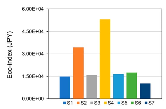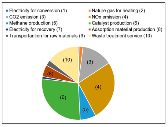 Figure 7 presents the eco-index of ReNOx technology. Four damages were integrated into the eco-index in line with their importance among the endpoints. The eco-index indicates the total environmental performance of the technology. Compared with the eco-index in the condition of 200 °C with a conversion rate of 95% (S1), it would increase by 1.3 times in the condition of 160 °C with a conversion rate of 80% (S2). If the NH3 was not treated soundly (S4), the eco-index would increase by 2.6 times. The fate of ammonia was reported as a crucial factor for SNCR [24]. This is also applicable to the results in this study. Feedstock format change (S3), adsorption material performance deterioration (S5), and recovery rate decline (S6) would increase the eco-index by 8%, 12%, and 18%, respectively. In the case of increased conversion rate and with renewable energy source (S7), the eco-index was decreased by 31%. The eco-index of the optimized scenario was broken down by processes, as shown in Figure 8. It indicated that the critical processes for the eco-index were catalyst production (28%), NOx emission (26%), waste treatment service (14%), CO2 emission (14%), methane production (7%), and adsorption material production (5%). The identification of key processes through contribution analysis serves as the starting point for the development of improvement measures. Monetary valuation plays an important role in solving trade-offs in life cycle assessment [33]. The eco-index achieved by monetary valuation enables technology developers to make comparisons with other technologies comprehensively and facilitates decision making in a more straightforward manner.