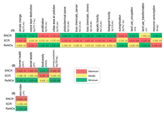 Comparison results at (1) impact, (2) damage, and (3) eco-index levels.