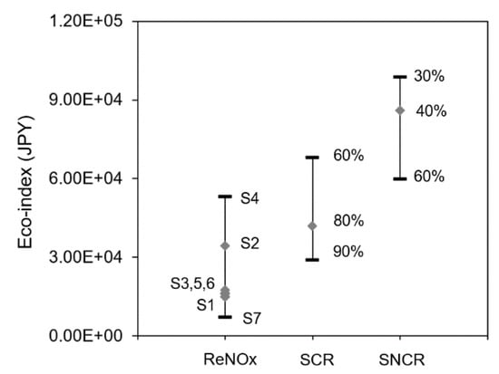 Quite large reduction rate ranges were reported for both SNCR [35] and SCR [36], which brought about a high uncertainty in their environmental impacts. In this context, a general reduction rate of 80% ranging from 60–90% [23] for SCR and a reduction rate of 40% ranging from 30–60% [26] for SNCR were calculated for the uncertainty analysis, as shown in Figure 10. It is worth noting that the high reduction rate was often accompanied by a high ammonia slip. The catalyst type and energy consumption were very different in different situations. There was even a higher reduction rate reported, but it was not calculated here due to lacking corresponding energy, catalyst, and ammonia slip information. It was found that when the reduction rate of SCR reached 90%, its eco-index was smaller than ReNOx in the case of a lower conversion rate (S2) and in the case without ammonia treatment (S4). But it was still larger than ReNOx in S1, S3, S5, S6, and S7. When the reduction rate of SNCR reached 60%, its eco-index was smaller than that of SCR with a reduction rate of 60%. There are evident overlaps for the eco-index of three techniques, which suggests that the reduction rate has a significant effect on their environmental performance.