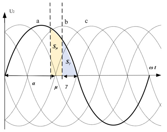 Sμ is the voltage–time area required to complete a commutation, as shown in Figure 2. The sum of commutation voltage–time area and turn-off voltage–time area S(μ + γ) can be expressed as: