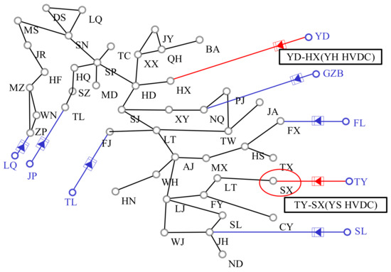 Take the operation status of East China Power Grid in the summer of 2018 as an example (Figure 3). To reveal the process of commutation failure and how the first commutation failure develops into subsequent commutation failure, a three-phase short circuit fault is set at the midpoint of a 500 kV Line near the SX converter station at 0.1 s, and the fault is removed after 5, 10 and 20 cycles respectively. The power observation of YS HVDC and nearby YH HVDC is shown in Figure 4.