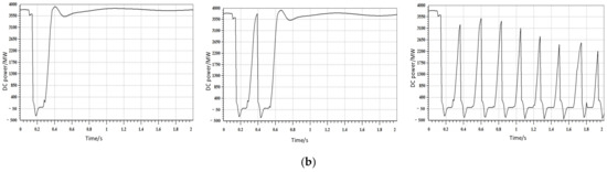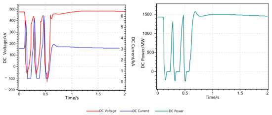 If a fault simulation of a three-phase short circuit is set at the midpoint of a 500 kV line of YH HVDC at 0.1 s, the fault is cleared at 0.5 s. The changes in electric quantity before and after the installation of DRPCE are shown in Figure 5 and Figure 6, respectively.