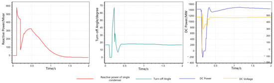 From the results shown in Figure 4, it can be seen that the three-phase short circuit fault at 0.1 s caused the commutation failure of YH HVDC: the line voltage dropped, the current rose and the transmission power was interrupted for a short time. As the fault was not cleared in time, the subsequent commutation failures of YH HVDC occurred on the basis of the first commutation failure. The voltage, current and DC power oscillated violently. Figure 5 shows that DRPCE can rapidly generate a large amount of reactive power, provide support for the converter bus, increase the turn-off angle, effectively inhibit the occurrence of subsequent commutation failures and maintain the stable operation of the system.