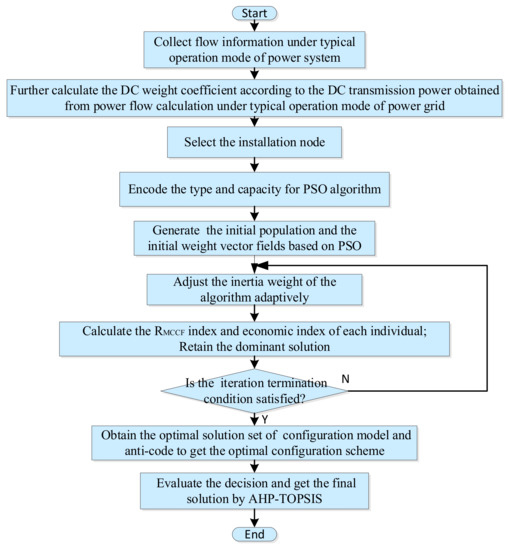 The basic idea of solving the DRPCE configuration problem is to use the improved PSO algorithm for multi-objective optimization and obtain a group of non-inferior solutions on the Pareto front. Subsequently, the AHP-TOPSIS (Analytic Hierarchy Process-Technique for Order Preference by Similarity to an Ideal Solution) evaluation method is used for the group of non-inferior solutions. The most reasonable configuration scheme is selected, and the solution process is shown in Figure 8.