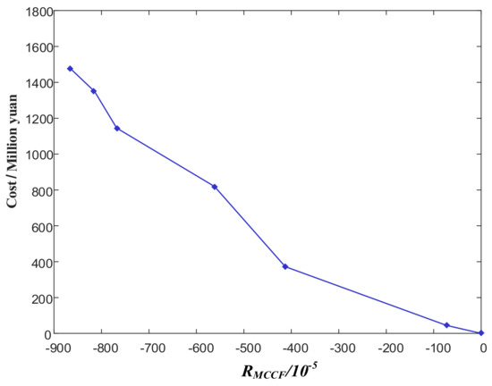 Subsequently, the improved PSO algorithm is used to optimize the type and capacity of dynamic reactive power compensation equipment. Combined with this engineering practice, the capacity of SVC is continuously adjustable, and the single capacity of the synchronous condenser is fixed at 300 Mvar. Through the improved PSO, a group of optimal configuration non-inferior solutions on the Pareto front are obtained, which consider both the economic performance and the inhibitory effect of subsequent commutation failure, as shown in Figure 10.