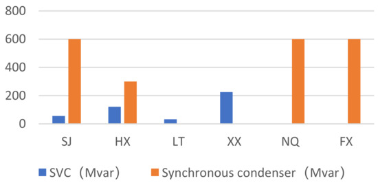 According to the analysis in Table 3 and Table 4, the configuration capacity of the synchronous condenser is always higher than that of SVC in the configuration scheme optimized by PSO, proving the conclusion that the reactive power compensation effect of the synchronous condenser is better than that of SVC. However, if we want to pursue economic benefits, we should prioritize the installation of SVC.