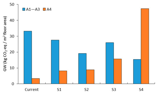 Global warming impact of cross-laminated timber material (module A1–A3) and transportation to construction site (module A4) for mass timber building under different scenarios (S1 sources from Inland Northwest, S2 sources from BC, Canada; S3 sources from QB, Canada; and S4 sources from Austria, Europe).