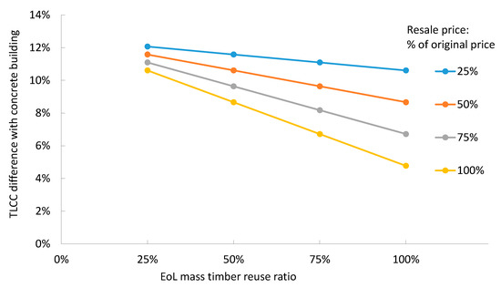 The reclaimed mass timber has financial value. It was assumed that the reclaimed mass timber could be re-sold as 50% of its virgin price, and under such assumption, the end-of-life salvage value of mass timber building was approximately $123 per m2 floor area, accounting 3% of TLCC. As expected, the salvage value was impacted by both the value and volume of recovered mass timber, and there were large uncertainties in these assumptions. To better understand these effects, different reclaiming rates (25–100%) and resale prices (25–100% of the original price) were evaluated and shown in Figure 6. Without considering the end-of-life costs, the TLCC costs of the mass timber building was about 13% higher than the concrete building. With considering the end of life where 25% of the mass timber was recovered and valued at 25% of its original value, the TLCC costs for the mass timber building were about 12% higher than the concrete building. When assuming the best-hope scenario for the reclaiming rate of 100% and the original value being maintained, the mass timber building’s TLCC would be only 4.8% higher than the concrete building. Although this assumption maybe considered unrealistic from the current view, it implies, anyhow, that the mass timber buildings ought to be designed and then deconstructed/demolished with outmost care to maintain the value of the CLT and glulam.
