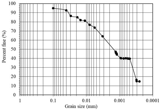 The clay obtained from Al-Qatif is rich in fines (material passing sieve no. 200) and measured as 76%, as indicated in Figure 1. Figure 1 presents the hydrometer analysis as part of gradation analysis conducted following ASTM D7928 [20]. The fine material in the sand–clay mixtures measured before conducting the hydraulic conductivity test was 11% and 15% for mixtures with 15% and 20% clay content. The values reported here represent the weight of fine material after wet sieving through sieve no. 200 and then oven drying.