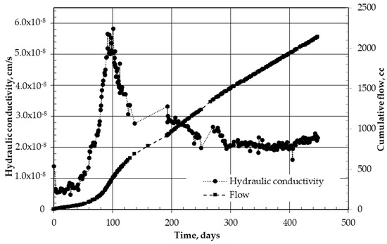 Marot et al. [27] also reported reduction of hydraulic conductivity due to erosion of fines and redeposion of sand particles. When the clay paste within the voids swell, cotton-like soft material is formed. This material is very easy to wash out along with the flowing water. As the penetration of moisture into the clay paste takes some time, further swelling will be initiated by inner particles from the clay core. This can explain the frequent occurrence of increases and decrease in the hydraulic conductivity values. The fluctuation of these values takes place within short intervals of time. The overall trend remains as a continuous drop in the hydraulic conductivity.