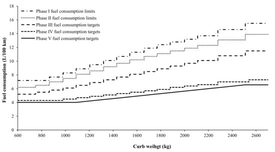 The target and limit values of China’s Phase I–V fuel consumption regulations.