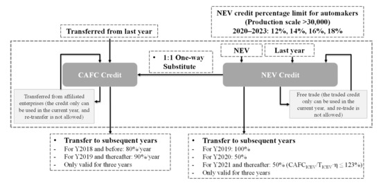 At the same time, to sustainably promote the development of NEVs, the dual credit regulation was officially implemented in April 2018 [18]. CAFC credits and NEV credits are coordinated and parallelly managed, as shown in Figure 2, to take the lead in establishing the long-term management mechanism of energy-saving and NEVs worldwide. The policy is one of the important symbols of the transition from policy-led to market-led development of NEVs in China. At the same time, due to the scale of the Chinese automobile market, the policy is expected to have a significant impact on the global NEV industry. The dual credit policy clearly defines the methods of calculation, transition, and transaction of the two types of credits. According to the policy, the mandatory proportion requirement is set for enterprise NEV credits, and NEV credits can one-way substitute the CAFC credits, to promote the development of NEVs. According to the influence of the previous policy and the market operation, the state made the first round of modifications to the calculation method of NEVs’ credits and the dual credit policy and officially began to implement the new version of the policy in 2021 [19].