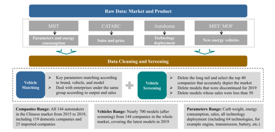 The sources of technology data mainly include US National Research Committee (NRC), Ricardo, Joint Research Center (JRC), International Council on Clean Transportation (ICCT), China Automotive Technology & Research Center (CATARC), and an enterprise survey. The database covers 4 categories (engine, transmission, vehicle and accessory, electric), 6 types of powertrains, and 64 technologies. In addition, as shown in Figure 4, the sources of market and product data mainly include the fuel consumption database of the Ministry of Industry and Information Technology (MIIT), CATARC, Auto Home, etc. The data were acquired, cleaned, and matched by Python. Finally, a complete database for the Chinese vehicle market was established. The database contains all 144 automakers, nearly 700 vehicle models (after screening) of the whole market in 2019, and all product parameters, such as curb weight, energy consumption, sales, and technology deployment.