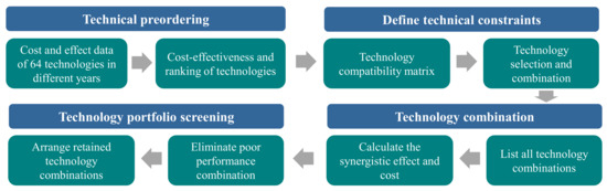 Through the establishment of a technical compatibility matrix, all levels of internal technical constraints can be defined, and technologies in each level including the gasoline engine, diesel engine, gearbox and accessories, vehicle, etc. can be combined. We can further calculate the technical combination effect and cost at all levels and use the greedy algorithm to pre-filter and sort the technology portfolios. Through the comparisons of different technology portfolios, the combinations with inferior effects and costs were deleted, and the rest of the technology portfolios were ranked according to their technical effects. The procedure is shown in Figure 6.