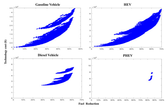 Based on the optimization results of the technology portfolios, the technology combination between different categories was conducted for five types of powertrain vehicles, as shown in Figure 5. For example, for traditional gasoline vehicles, advanced gasoline technologies, transmission and accessory technologies, and vehicle technologies can be applied, and the final technology portfolio of traditional gasoline vehicles can be further optimized to 21,896 technology combinations. For HEVs, advanced gasoline technologies, transmission and accessory technologies, vehicle technologies, and HEV technologies (start-stop, micro hybrid, mild hybrid, strong hybrid) can be applied; the final technology portfolio of HEVs can be further optimized to 90,160 technology combinations. Finally, the technology combination cloud maps of all powertrains can be obtained by Matlab. Here, taking the midsize vehicles as an example, the combination cloud maps of different powertrains in 2025 are shown in Figure 7.