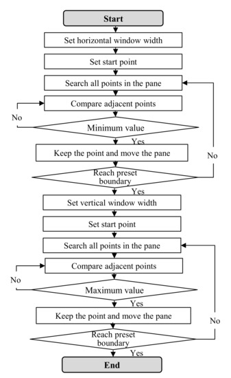 To obtain Pareto optimal sets of different cloud maps, a sliding window algorithm was developed to further optimize the cloud maps. The algorithm logic diagram is shown in Figure 8. In the algorithm, the long sawtooth noise was eliminated by the double sliding windows to ensure the data quality of the Pareto optimal data set. The sliding window also had a performance trade-off: the wider the pane, the more likely it is to miss the optimal point; the narrower the pane, the more noise points and zigzags will occur. Therefore, the parameters should be adjusted according to the needs of different powertrain clouds to achieve optimal results. For a traditional gasoline car, the width of the transverse pane is set to 0.002 and the width of the longitudinal pane is set to 100.