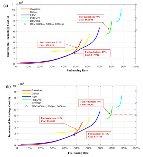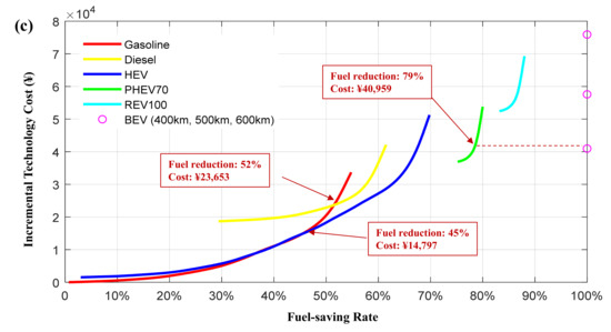 The results show that, for midsize vehicles, gasoline technologies still have a great cost-effectiveness advantage when the fuel-saving requirement is less than 46%, and the space for PHEVs and REVs is gradually shrinking due to the cost reduction of BEVs. BEV400 will be better than PHEV70 and REV100 when the fuel-saving requirement is higher than 79%. In addition, diesel engines never have the advantage of cost-effectiveness in the passenger car market.