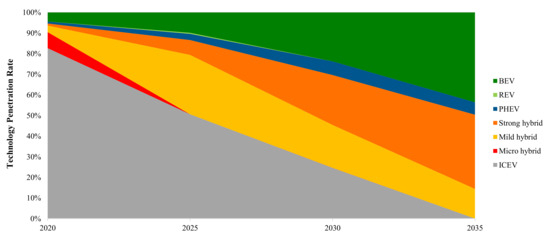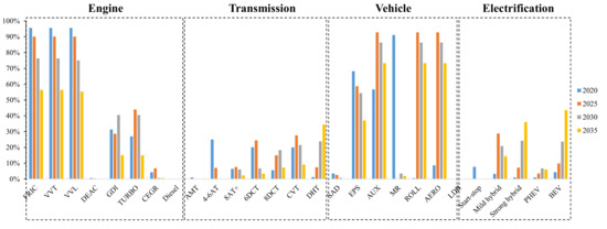 Based on the comprehensive database and the technology selection model established in Section 2.3, technology pathways to comply with the CAFC regulation of the whole industry were studied. As described before, under the CAFC regulation, every automaker will make their technology strategy and adjust their product matrix to comply with the regulation. The technology selection model designed in this study simulated the decision-making and technology selection process of automakers and obtained the optimal technology pathway as well as penetration rates of different powertrains and technologies. Every single automaker should meet the regulation. Therefore, the final results of the whole market could be obtained by adding up the results of all automakers. Figure 10, Figure 11 and Figure 12 show the overall technology pathway and cost of the industry to meet the CAFC regulations from 2025–2035.