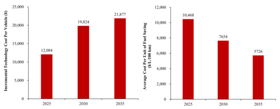 As mentioned above, every automaker will make their technology strategy and adjust their product matrix to comply with the regulation at the lowest cost. The objective function of the model is the total compliance cost, which means the automaker meets the policy with the minimum incremental technology cost compared to the fleet in 2019. Further, in this study, two factors were used to represent the compliance difficulty and cost: the incremental technology cost per vehicle and the average cost per unit of fuel saving. The average cost per unit of fuel saving is the result of incremental technology cost per vehicle divided by fuel reduction. The higher the average cost per unit of fuel saving, the more difficult it to comply with the regulation.