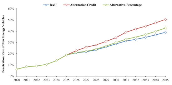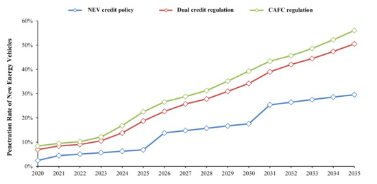 Figure 14 compares different regulation scenarios, namely NEV credit regulation-only, CAFC regulation-only, and dual credit regulation. In the premise condition of Figure 14, the annual average fuel consumption reduction rate for ICEVs is set as a fixed value, the final result is the penetration rate of NEVs. Based on the annual average fuel consumption reduction rate of 2% for ICEVs, it can be seen that the NEV-only regulation determines the minimum requirements of all OEMs, and the CAFC regulation is stricter than the dual credit regulation. The minimum NEV penetration rate requirement of the CAFC regulation is higher than that of the dual credit regulation. The reason is that NEVs can get double privileges on both NEV credit and CAFC credit. Meanwhile, NEV credit can one-way substitute CAFC credit, which is equivalent to the average stringency of the NEV-only regulation and the CAFC regulation.