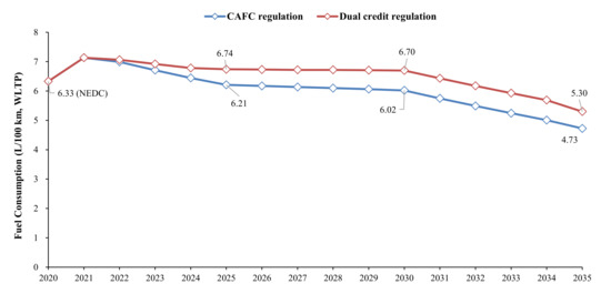 In contrast, if we set the NEV penetration rate as a fixed value according to the national technology roadmap, and set the fuel consumption of ICEVs as the variable and the final result, as we can see from Figure 15, the fuel consumption of ICEVs under the CAFC regulation needs to decrease more than that of the dual credit regulations to get the penetration target of NEVs in national technology roadmap (20% in 2025, 40% in 2030, 50% in 2035). In 2035, the fuel consumption of ICEVs will drop to 5.3 L/100 km under the dual credit regulation and will drop to 4.73 L/100 km under the CAFC regulation. That is, the minimum requirement of CAFC regulation is relatively stricter.