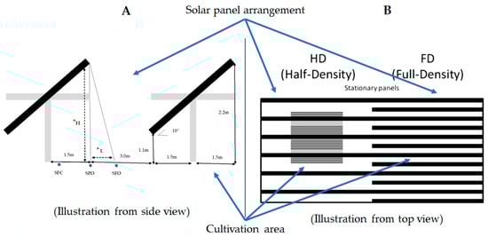 The microclimate aspect under the solar PV structure should be taken into account in the selection of suitable crops to be cultivated in solar farms [5,46,103,126]. A setup by Refs. [42,134] in particular divided the area beneath the solar panel into three sub-treatments: (1) sky fully open area between panels (SFO); (2) Solar partially open between panels (SPO); (3) solar fully covered area under panels (SFC) as illustrated in Figure 3A. SFO zones are located between the edges of mounted photovoltaic panels and areas that have received full light [28]. No shade covers the SFO zone, according to the shadow length estimate [132], while SPO areas are situated in the penumbra and have been subjected to episodic shade [104]. SFC areas are located immediately under the photovoltaic panels and receive complete shade [73]. However, the division of the sub-treatments are subjective and subjected to the solar photovoltaic design [5,19,38,91]. For example, the AVS design at Montpellier Experimental Agrivoltaic Station by [4,6,18,69] (as described on page 9) is high in length, and is thus less suitable to be divided into SFO, SPO, and SFC. Previous researchers at that station classified the area beneath the solar panel as FD and HD. The average proportion of daily radiation emitted below the solar panel (FD and HD treatments) relative to the FS treatment varies with the growing season. In general, AVS is not recommended in crop rotation systems [41]. However, crop rotation could increase the production of agriculture in AVS farms [69], especially in regions that experience different seasons throughout the year [128]. Furthermore, when used in conjunction with permanent cultures—such as berries, bananas, or wine grapes—the cost of these types of applications is smaller, thus delivering increased efficiency through the optimization of techno-ecological synergies [41].