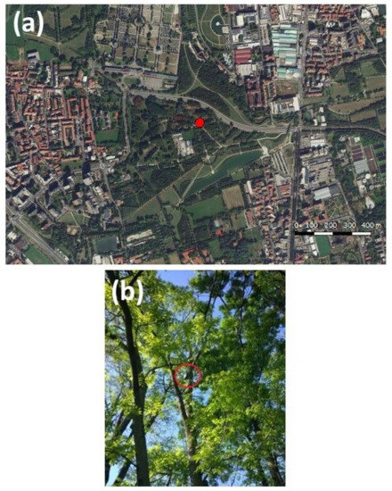 Figure 1a shows the position of the SET recorder inside the park, located near the Bruzzano cemetery, in a suburban context. The land coverage of this area is quite green, with the widespread presence of roads (ranging from pedestrian paths within green areas to main arterial roads), activities and residential areas. The SET recorder was mounted on a tree at a height of five metres, as shown in