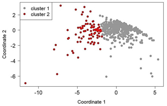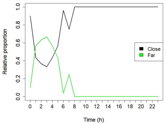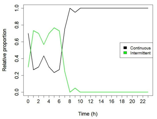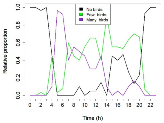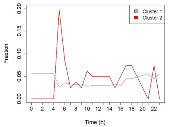Figure 14. Here, we can clearly see how cluster 2 presents a peak of recordings during the morning chorus and the afternoon. No recordings were observed during the night period. On the contrary, cluster 1 includes recordings that were evenly distributed throughout the hours of the day and the night period (slightly higher in the latter).