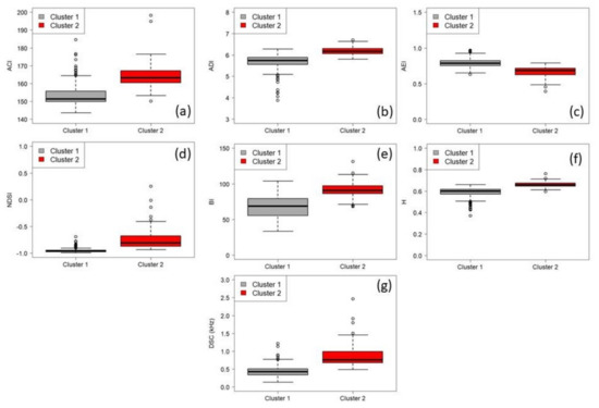 Figure 5 for the two clusters obtained from the combination of all the considered eco-acoustic indices. The presence of biophonic activity was effectively captured by the ACI index sensitive to frequency and time modulation typical of birds’ singing. The presence in cluster 2 of both biophonic and anthropogenic activities, hence, with a wider frequency composition, implies higher values of the ADI index (opposite consideration for AEI). This result was confirmed also by the acoustic entropy index, H, which measures entropy in both time and frequency space.