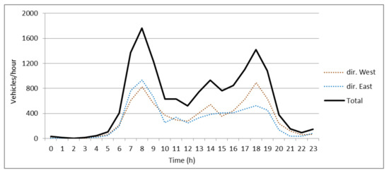 The recorder position was approximately 90 m from a peri-urban arterial road with continuous road traffic noise emissions; more specifically, the daily mean traffic flow was approximately 22,000 vehicles (this number is the result of the following acoustic equivalence: a light commercial vehicle is equivalent to four cars and a heavy vehicle is equivalent to eight cars), the estimated mean traffic speed is approximately 50–60 km/h, with very rare congested flow events. The eastward direction of the road is the nearest to the measurement site, and it showed a peak of vehicles at 8 a.m.