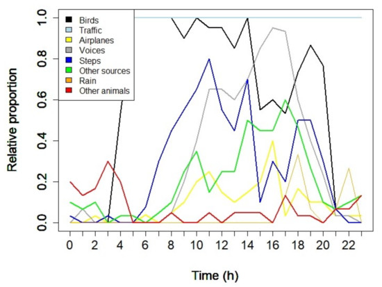 In particular, we focused on determining biophonic activities (mainly avian vocalization and other animals), characteristics of technophonies sources (mainly road traffic noise and airplane fly-bys), human presence (voices and steps) and geophonies (rain and wind).