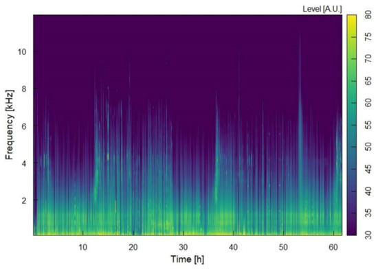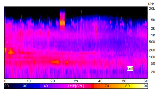 Figure 12. Here, we can observe an intense frequency band at low frequencies up to approximately 1.5 kHz, which is most likely associated with traffic noise and less intense at higher frequencies, up to (8–10) kHz. The latter is associated with sounds produced by biophonic activity.