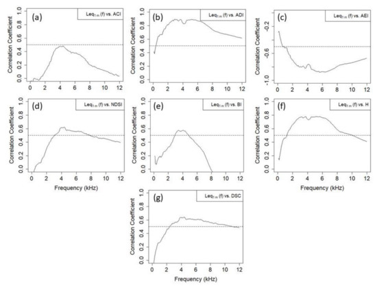 We can clearly see how each index presents a maximum of correlation for frequencies above 2 kHz. In particular, ACI and BI present a peak distribution with a maximum at approximately 4 kHz, rapidly falling upwards. The other indices present a correlation coefficient that remains quite high even at frequencies of 10–12 kHz. The correlation coefficient for ACI is below 0.5 (see dashed line in