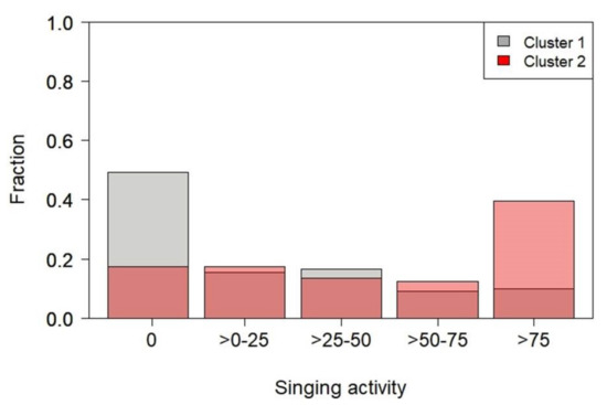 Figure 15 reports the singing activity quantified as the percentage of singing presence in the audio recording time. About 50% of cluster 1 is made of recordings with a complete absence of bird activity with a minimum of about 10% in the interval >(50–75)% and >75% of singing activity. Cluster 2 presents a maximum of approximately 40% of recordings with singing activity above 75%.