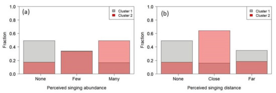 Figure 16a, confirmed the previous results: an absence of activity for the majority of recordings in cluster 1 (∼50%), many bird singings in the majority of cluster 2 (∼50%) and few bird singings equally distributed in the two clusters. Regarding the perceived singing distance, cluster 1’s composition was made of audio recordings with either an absence or far singing activity; whereas, in cluster 2, we found recordings where the singing activity was perceived as close (see