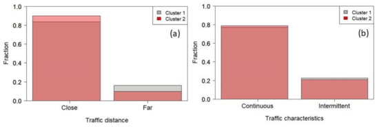 Figure 17a,b reports the distribution of audio recordings in the two clusters versus the presence of traffic perceived in terms of two categories: distance and dynamic characteristics. The results indicate that both clusters presented the majority of audio recordings characterized by close perceived distance and continuous traffic noise characteristics. As a summary,
