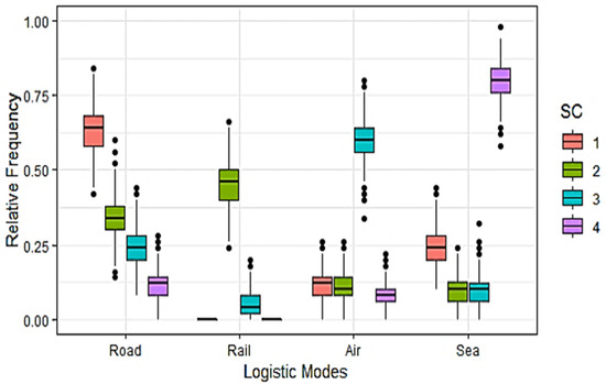 We assume that each supply chain, on average, utilizes these modes in the following proportions: (0.63, 0, 0.12, 0.25) for SC1; (0.34, 0.45, 0.11, 0.10) for SC2; (0.34, 0.45, 0.11, 0.10) for SC3; and (0.12, 0, 0.08, 0.80) for SC4. Figure 1 displays boxplots summarizing the distributions of simulated proportions of logistic mode utilization by the four supply chains. It is worth emphasizing that these figures have been generated randomly for illustrative purposes with no pretense to reflect any real-world situation.