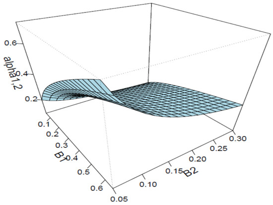 According to Equation (6) which follows from Equations (1) and (2) and MacArthur and Levins’s [25] formula for competition coefficient (Equation (4)), the competitive effect of one supply chain on another is proportional to the niche overlap. If the niche breadths of the competitors are equal, then the competitive effect is symmetric and equal to the niche overlap. In most cases though, the niche breadths would widely differ among competitors, and following from Equation (6), the competitor with the narrowest niche (the specialist) would be better off. This is because the ratio of the niche breaths of the specialist to that of its competitor, and hence the square root of this ratio which appears on the left-hand-side of Equation (6) will be smaller, and vice-versa. Considering for instance the competitive effects of supply chains 2 and 4 on each other displayed in Table 3, supply chain 2 has a broader niche with standardized niche breadth 0.65, while the niche of supply chain 4 is relatively narrow with standardized niche breadth 0.17. The overlap between the niches of the two supply chains is 0.27 (Table 2). However, the competitive effect of supply chain 2 on supply chain 4 is 0.20, which is roughly twice as small as the effect (0.38) of supply chain 4 on supply chain 2. This corroborates the benefit of specialization in a competitive environment as a strategy for mitigating competition. To further exemplify the connection between niche overlaps, niche breadths and competitive effects, Figure 2 shows on the z-axis the competitive effect of a hypothetical supply chain 2 on another hypothetical supply chain 1 when the niche overlap between the two supply chains is 0.20 and the niche breadths of the two supply chains assume different value appearing on the x- and y-axis.