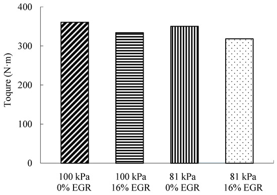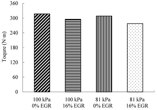 When the atmospheric pressure rises from 81 kPa to 100 kPa, the inlet air mass flow rate decreases and the combustion process deteriorates; therefore, the engine torque is reduced [21,22]. When the atmospheric pressure is the same, with the increase of EGR rate, the oxygen concentration in-cylinder and the air-to-fuel ratio decrease gradually, which leads to worse combustion quality and power performance.