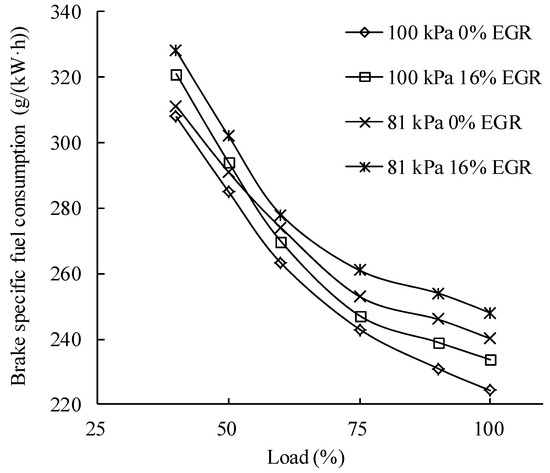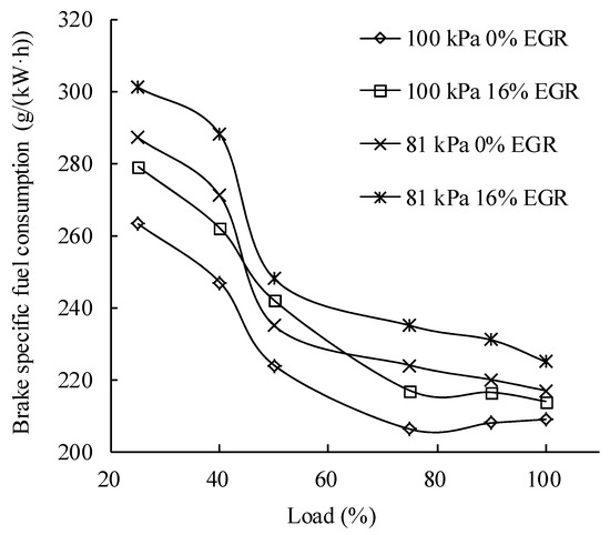 When the load is small, the fuel cannot combust completely at low temperature, which leads to increase of the fuel consumption [23]. As the load increases, the temperature rises and the combustion is improved. When the atmospheric pressure rises, with the increase of the air density the intake air mass flow rate increases. In addition, the combustion process and the fuel consumption improve with the help of oxygen content of biodiesel and ethanol, which improves the incomplete combustion of the rich mixture. At the same atmospheric pressure and the small load, because the fuel supply is small and the excess air coefficient is large, the EGR rate has little effect on the fuel economy. At medium and high loads, with the increase of the EGR rate, the excess air ratio and the combustion rate decreases; moreover, polyatomic molecular gases such as CO2 and H2O in the exhaust gas increase, which causes the decrease of specific heat capacity of the mixture and the temperature in-cylinder, and results in poor fuel economy. A small EGR rate should be used at big load [24,25] in order to avoid excessive economical degradation of the engine.