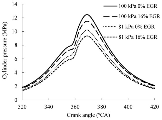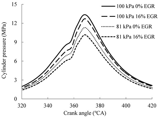 When the atmospheric pressure is the same, the increase of EGR rate leads to the decrease of the excess air coefficient and the quantity of combustible mixture, which results in the reduction of the maximum cylinder pressure [26,27]. When the atmospheric pressure increases, with the increase of the inlet gas pressure and the air oxygen content, it is favorable to form the combustible mixture so as to raise the maximum cylinder pressure.