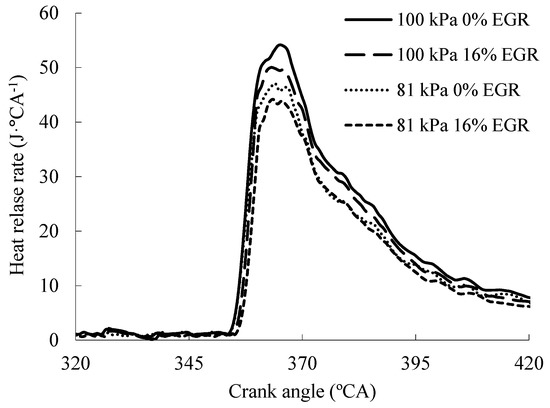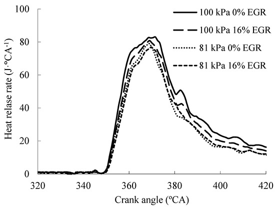 The comparison of the heat release rates of B15E5 fuel at 2200 rpm and 1800 rpm at different EGR rates and the atmospheric pressures of 81 kPa and 100 kPa are shown in Figure 8 and Figure 9, respectively, which shows that the peak heat release rate at 100 kPa is higher than that of 81 kPa, and when the atmospheric pressure is the same, the peak heat release rate of 0% EGR is higher than that of 16% EGR.