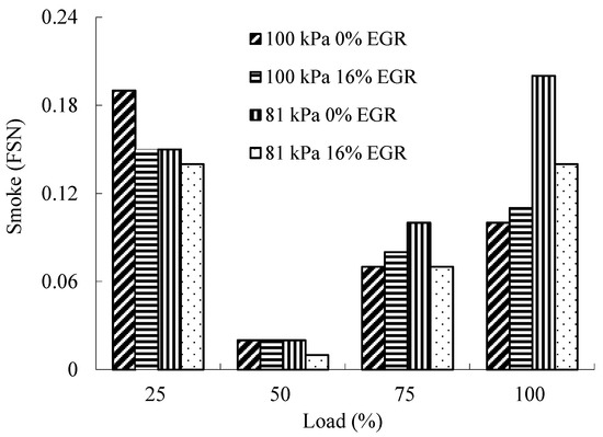 When the load is low, the low temperature in-cylinder leads to insufficient combustion, and the smoke emission is high. With the increase of the load, the temperature in-cylinder turns high, and the combustion process is improved; therefore, the smoke emission is reduced. At the high load, with the increase of the fuel injection quantity, the excess air coefficient turns small, so the combustion is insufficient, which leads to high amount of smoke emission. When the atmospheric pressure rises from 81 kPa to 100 kPa, the intake air mass flow rate increases, so the air-to-fuel ratio increases, which improves the combustion process and the smoke emission. At the same atmospheric pressure, with the increase of EGR rate, more residual exhaust gas enters the engine cylinder and the fresh air volume decreases, which results in the reduction of excess air coefficient [29] and the smoke emission increases.