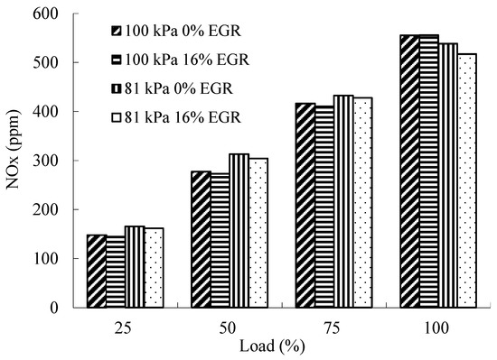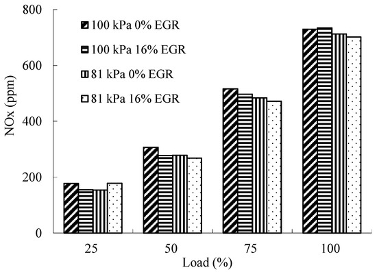 When the atmospheric pressure goes up, the increase of oxygen content in-cylinder is favorable to the formation of NOx. When the atmospheric pressure is 81 kPa, the reduction of the oxygen content in-cylinder inhibits the formation of NOx [17]. At low load, temperature has a greater impact on NOx formation; at medium and low loads, temperature is considered to have a greater impact on NOx formation than oxygen; at high loads, oxygen is considered to have a greater impact on NOx formation than temperature. At certain atmospheric pressure, EGR has a weak influence on excess air coefficient at low load; however, EGR reduces the combustion temperature in the cylinder and at the same time reduces the oxygen concentration in the intake gas at medium and high load, thus reducing the NOx emissions [30].