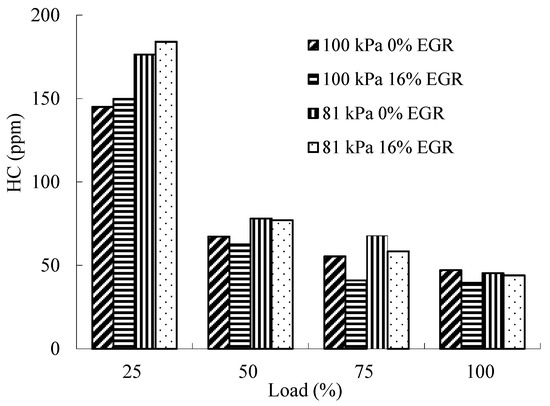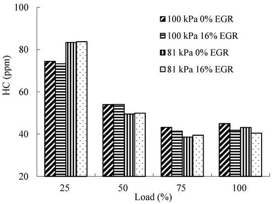 Figure 14 and Figure 15 show the comparison of HC emissions of B15E5 fuel at 2200 rpm and 1800 rpm under different EGR rate and atmospheric pressures of 81 kPa and 100 kPa, respectively. When the engine speed is 2200 rpm, and the load is under 60%, HC emission decreases with the increase of load. When the load is between 60% and 80%, HC emission increases with the rise of load. When the engine speed is 1800 rpm, HC emission decreases with the increase of load, and the change is more obvious at low load, but less at high load. When the atmospheric pressure is rises from 81 kPa to 100 kPa, the HC emission decreases, and the decrease range is 9.3–19.1%; when the atmospheric pressure is the same, at the medium and high load area, the HC emission shows a downward trend with the increase of EGR rate and the decrease range is 3.3–4.5%.