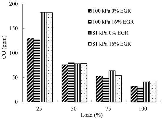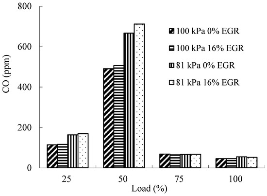 When the atmospheric pressure rises, the air intake condition is better and the combustion is more sufficient, so the CO emission is much lower. At the same pressure, the in-cylinder oxygen concentration decreases with the increase of the EGR rate, and combustion temperature in-cylinder also decreases, so the CO concentration in exhaust gas also increases.