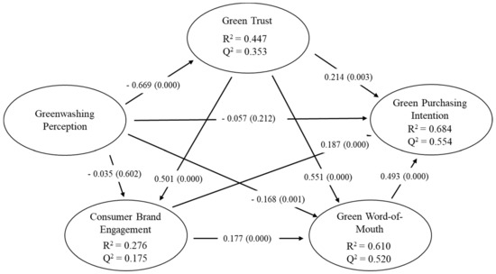The model predicts 68.4% of the variance in green purchasing intention, 61% of the variance in green WOM, 44.7% of the variance in green trust and 27.6% of the variance in CBE. Furthermore, the effect size (f2) of greenwashing perception, green trust, CBE and green WOM in relation to green purchasing intention suggests weak effect size at the structural level whereas green WOM in relation to green purchasing intention has a medium effect size [49]. All the dependent variables’ Stone–Geisser’s Q2 are larger than zero, and therefore confirm the model’s predictive validity.