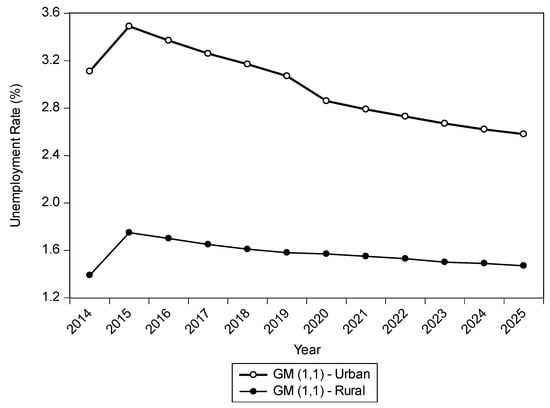 Comparison of the average forecasted unemployment rates in urban and rural areas with GM (1,1).
