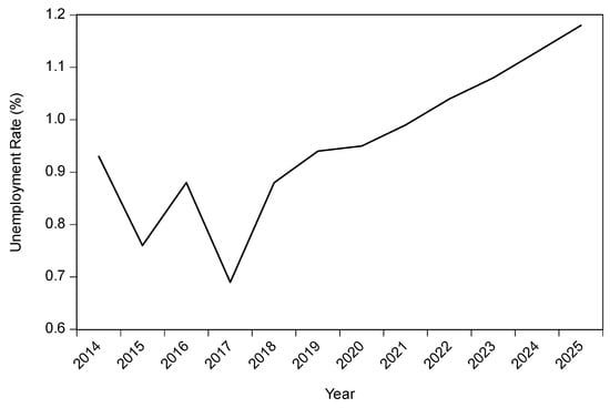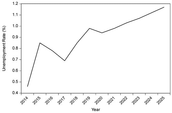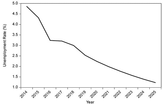 Figure 5 shows the unemployment rate for the rural area of the Northern Midlands and Mountains. It can be seen that the rural unemployment rate reached 0.85% in 2015, a tremendous increase from 2014, then it decreased to 0.78% in 2016. Following the downward trend, the rate decreased to 0.69% in 2017. There were increases in the rate of 0.85% in 2018 and 0.98% in 2019. Estimations for the period from 2020–2025 indicate that the unemployment rate would continue its downward trend as it could increase to about 1.17% by 2025. Figure 6 shows the unemployment rate for the urban area of the North Central region. The North Central region’s unemployment rate was quite volatile. Starting at 3.71% in 2014, it increased at the rate of 11.6% to 4.14% in 2015. In the following years, the urban unemployment rate fluctuated between 3.95% to 4.28%. The rate is then expected to decrease for the next six consecutive years to around 3.77% in 2025.